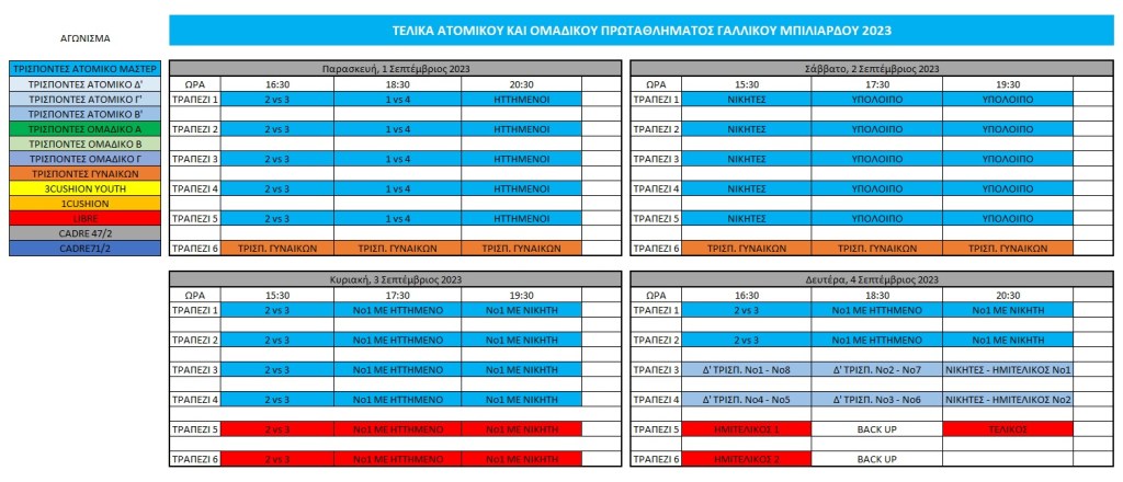Στις εικόνες που ακολουθούν μπορείτε να βρείτε το πρόγραμμα για την τελική φάση του πρωταθλήματος, η οποία θα διεξαχθεί από 1η Σεπτεμβρίου έως 15 Σεπτεμβρίου στα καταστήματα Lost και La Casa de Billiard.